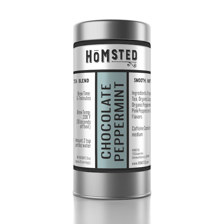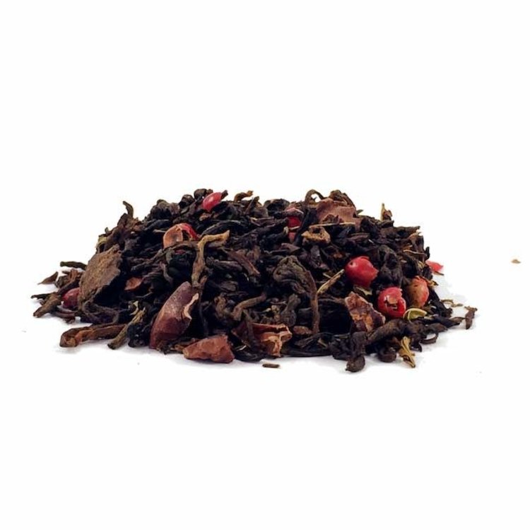 Ingredients: Organic Pu-erh Tea, Organic Cacao Nibs, Organic Peppermint, Organic Pink Peppercorn, Natural Flavors Caffeine Content: medium