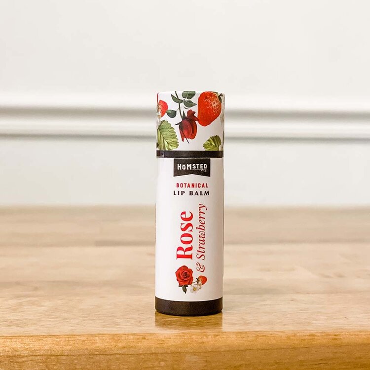 Rose & Strawberry: olive oil*, jojoba oil*, beeswax, shea butter*, cocoa butter*, coconut oil*, rose absolute, vitamin E, natural strawberry flavor.